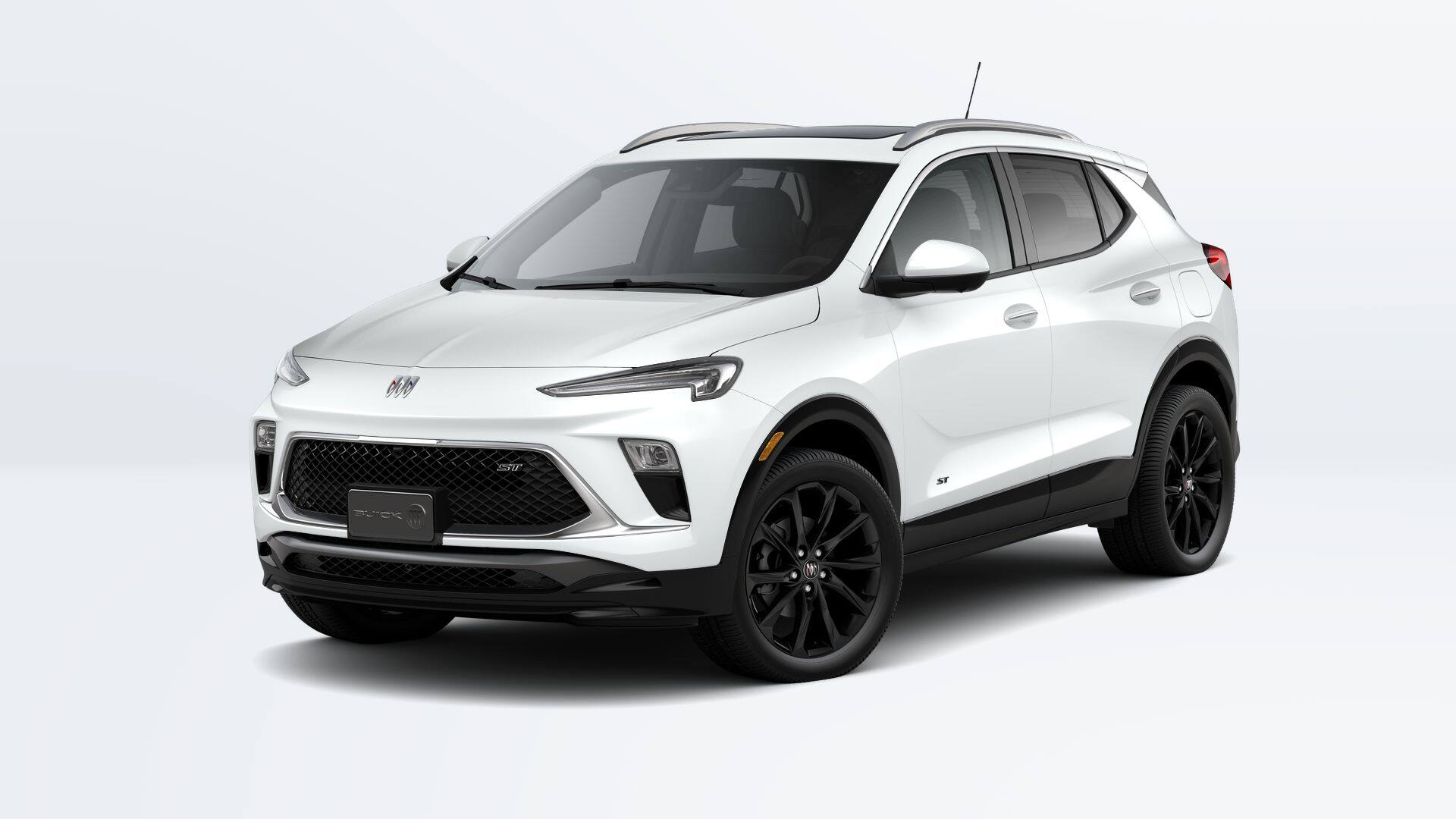 2026 Buick Encore GX Sport Touring in Summit White and Ebony Seats Interior With Santorini Blue Stitc Premium Synthetic and is equipped with the following: AWD ECOTEC 1.3L Turbo Advanced Technology Package (Adaptive Cruise Control, HD Surround Vision, Rear Park Assist, and Wireless Charging), Comfort Package (2-Way Power Driver Lumbar Control, 8-Way Power Driver Seat Adjuster, Flat-Folding Front Passenger Seatback, Heated Driver and Front Passenger Seats, Heated Steering Wheel, and Rear Center Armrest), Experience Buick Package (Power Panoramic Tilt-Sliding Moonroof and Wheels: 19 Gloss Black Aluminum), Preferred Equipment Group 1SD, 3.17 Final Drive Axle Ratio, 4-Way Manual Passenger Seat Adjuster, 4-Wheel Disc Brakes, 6-Way Manual Driver Seat Adjuster, 7 Speakers, ABS brakes, Air Conditioning, Alloy wheels, AM/FM radio: SiriusXM, Auto High-beam Headlights, Automatic temperature control, Brake assist, Bumpers: body-color, Compass, Delay-off headlights, Driver door bin, Driver vanity mirror, Dual front impact airbags, Dual front side impact airbags, Electronic Stability Control, Emergency communication system: OnStar and Buick connected services capable, Enhanced Performance 7-Speaker System with Amplifier, Front anti-roll bar, Front Bucket Seats, Front Center Armrest, Front reading lights, Front wheel independent suspension, Fully automatic headlights, Heated door mirrors, Illuminated entry, Knee airbag, Leatherette Seat Trim, Low tire pressure warning, Mechanical Jack with Tools, Mobile Service Plus, Occupant sensing airbag, Outside temperature display, Overhead airbag, Overhead console, Panic alarm, Passenger door bin, Passenger vanity mirror, Power door mirrors, Power Liftgate, Power steering, Power windows, Radio data system, Radio: AM/FM Audio System, Rear reading lights, Rear side impact airbag, Rear window defroster, Rear window wiper, Remote keyless entry, Ride and Handling Suspension, Security system, SiriusXM Trial Subscription, Speed control, Speed-sensing steering, Split folding rear seat, Spoiler, Sport steering wheel, Steering wheel mounted audio controls, Tachometer, Telescoping steering wheel, Tilt steering wheel, Traction control, Trip computer, Variably intermittent wipers, Wheels: 18 Gloss Black Aluminum, and Wireless Apple CarPlay/Wireless Android Auto.